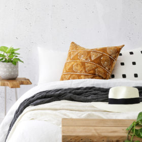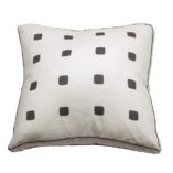 Our Palm Springs linen cushion is a minimalist, modular style with curved edges. The silkscreened pattern is printed on luxurious heavy prewashed milk linen. The style is a custom 50 x 55 with a black satin piped gusset. Our recommended inner size is 55 x 60 cm which we can sell to you separately.
