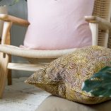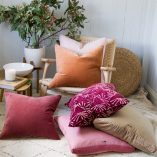 Our ‘essentials’ range are plain styles that are good enough alone and also work beautifully to enhance our printed styles. The Essential Guerilla Linen cushion is generously sized and gusseted with bespoke dyed cotton velvet in the same colour. This versatile cushion is great with chartreuse, earthy green and browns and our ethnic indigo styles.  Our recommended inner size is 60 cm in 100% duck feather, which we can sell to you separately.