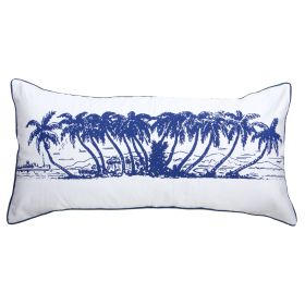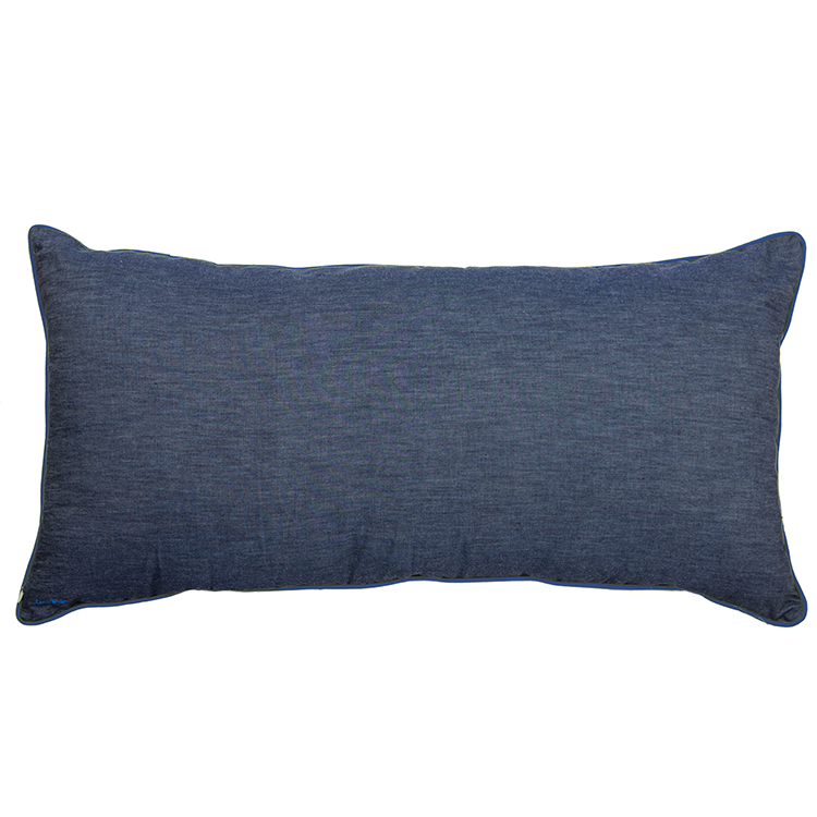 The perfect lovers cushion as it is big enough for two to get cosy! The front side is silk screen printed by hand with glorious coconut palms for lazy days and the reverse side is a chambray denim. It is finished with a blue piped edge. Our recommended inner size is 45 x 90 cm which we can sell to you separately.