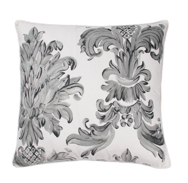 A generous cushion cover made from a single oxford cotton canvas and silkscreen printed from our hand painted damask original. The style has the same print on the reverse side and is finished with a white canvas piping. Our recommended inner size is 55 cm which we can sell to you separately.