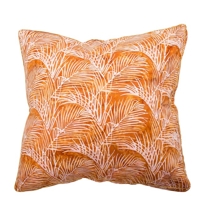Our Quince Bangalow palm batik is processed by hand on velvety 100% brushed cotton canvas and gusseted with gold piping. The recommended inner size is 60 cm which we can sell to you separately.
